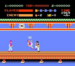 一开始左边右边就会出现一群的小喽啰,用站拳或蹲踢击退他们,打完后赶快往左边移动,因为这些家伙是无限的,打完了会不断地补货~ 用脚踢100分,用拳200分。其中会出现射飞镖的蓝衣角色,耐久力比较强些,需要打两下才打得掉,跳踢一下,蹲拳一下,这样分数是800分,比光用脚踢500分高。