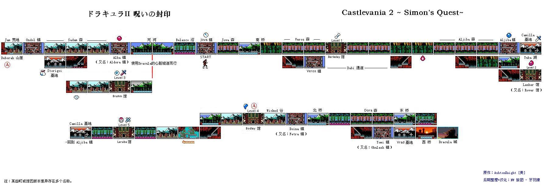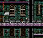 恶魔城2-西蒙的冒险(机种:FC 类型:ARPG 作者:Andy) 游戏一开始,本作主角恶魔猎人--西蒙手持祖先留传下来的长鞭,只身一人来到恶魔城的一个城市里(城市1)。先走到城中右边如图1所示用身上仅有的50块钱(在这个恶魔城游戏中钱就是用红心表示的)向一个商人买一个白水晶球(50个红心),然后去右边的森林里打死一些敌人后把钱积攒到150个红心后回到城市1中,走进卖白水晶球商人旁边的屋子里如图2所示,向屋内的商人买一个圣水瓶(50个红心)(游戏中使用各种道具的方法为:按START键后,在出现的菜单中用方向键选中要用的道具后按START键,在游戏中先按住上键再按B键。圣水瓶有一个很大的作用:圣水瓶可以用来探路和打碎石块,要经常用它来探路,因为有一些城市中的石墙(在城市中有一些房间里没有人,那这房间里就有秘道,如在墙上或是地上的石块可以打碎)和存放德拉克拉伯爵遗物的馆(以下简称为鬼城)中还有一些路和石块是假的可以用它打开,如果用圣水瓶能扔透石墙的话,那么这个石墙就是假的,可以走进去,要多多利用它的这些功能,冒险中才能胜利),然后再去左边的屋子里向另一个商人买一个荆鞭(100个红心),现在冒险的必备道具买好了,可以开始冒险了。