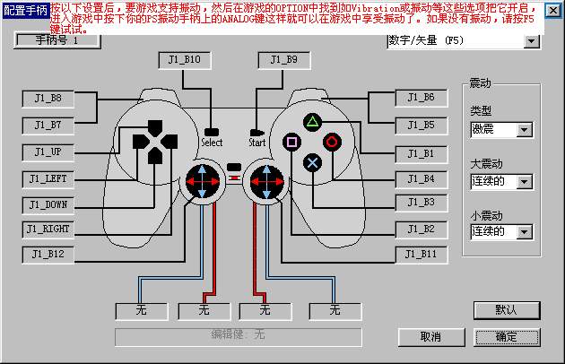 Kazzuya Software Driver插件对2D游戏速度也比较快,用于彩京打击者1945 II代能得到较好的速度,而且对勇者斗恶龙7支持的很好,如果你的显卡用OpenGL或D3D玩2D游戏太慢的话就用它吧。它的设置请见图5,如果你想全屏幕运行PS的游戏,请在图形插件设置中把全屏显示选中即可。 选中上面介绍的其中一个插件后按其相应的图片进行设置,然后点击继续进入下一个音频配置对话框,在下方的音频插件列表中选ePSXe SPU core即可,它ePSXe默认的音频插件不用进行配置。然后点击继续进入下一个光驱配置对话框,在CD-Rom盘符设置后面选中你的光驱盘符,然后在下方的光驱插件列表中选ePSXe CDR ASPI core即可。然后点击继续进入下一个手柄配置对话框,点击手柄1或手柄2按钮进入手柄按钮配置菜单(如图6),在这里你可以把按钮改为键盘上的键也可以改为你的手柄上的键,如果你的手柄是震动手柄(像Andy的PS原装震动手柄通过改造就可以在PC上用了,而且还可以震动哦),按图6中进行设置,在图6右上方的下拉列表中选“数字/矢量(F5)”,然后在震动类型中选“激震”,在大震动和小震动中都选“连续的”,就可以支持震动了,不过如果游戏不支持震动或你没有在游戏中把震动选项打开的话那手柄也不会震的。正常时Andy推荐你选“屏蔽”,震动类型选“DirectX”即可,如果你在游戏中按手柄上的任何键都没有反应的话,请按一下F5键,如果还是没有反应的话,就按一下F4键。
