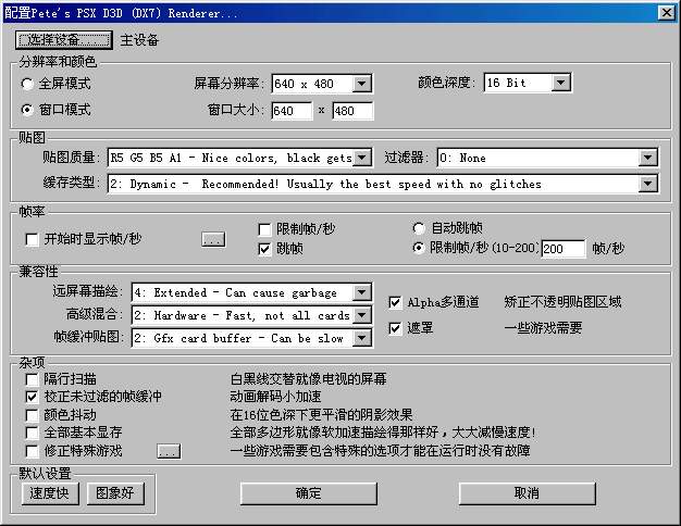 Pete D3D Driver插件对3D游戏速度比较快,如果你的显卡用OpenGL太慢的话就用它吧,不过它的显示效果就不太好。它的设置请见图3,如果你想全屏幕运行PS的游戏,请在分辨率和颜色中把全屏模式选中即可。