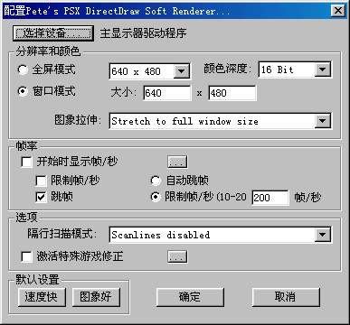 Pete Soft Driver插件对2D游戏速度比较快,如果你的显卡用OpenGL或D3D玩2D游戏太慢的话就用它吧。它的设置请见图4,如果你想全屏幕运行PS的游戏,请在分辨率和颜色中把全屏模式选中即可。